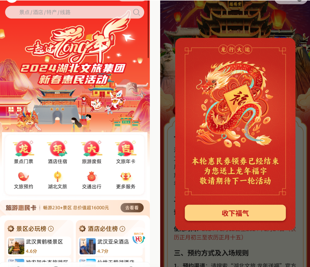 惠民政策積極落實。為保障湖北文旅“龍年送福”活動工作有序進行,數(shù)旅集團一卡通公司積極部署,組織技術(shù)研發(fā)、運營等工作專班開發(fā)活動平臺,在除夕、大年初一晝夜加班,對接十一個地市州文旅局,數(shù)百家景區(qū)企業(yè),順利完成湖北文旅龍年送?;顒?strong>60萬張免費惠民門票的預(yù)約及核銷工作,并承擔(dān)游客入園等相關(guān)客服、客訴問題處理。