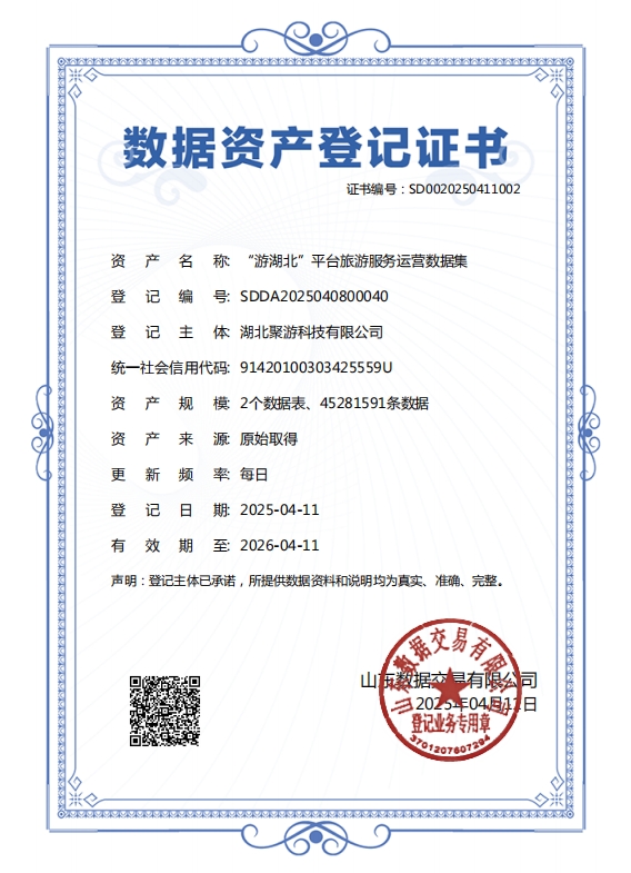 近日,湖北數(shù)字文旅集團旗下聚游科技公司在數(shù)據(jù)資產(chǎn)化領(lǐng)域傳來捷報。4月11日,其研發(fā)的"游湖北平臺旅游服務(wù)運營數(shù)據(jù)集"成功取得數(shù)據(jù)資產(chǎn)登記認證。
