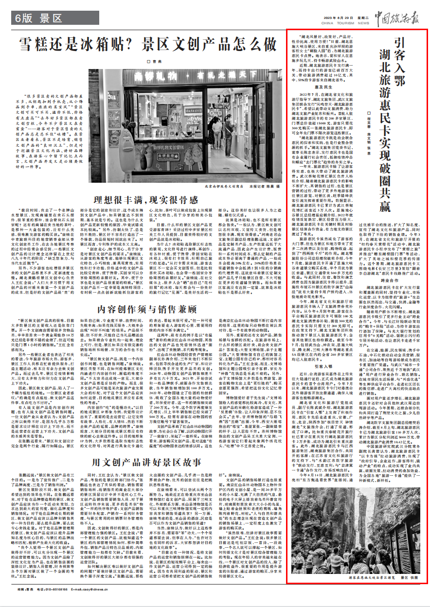 編者按:日前,《中國旅游報》以《引客入鄂 湖北旅游惠民卡實現(xiàn)破圈共贏》為題,聚焦湖北旅游惠民卡“引客入鄂”、撬動產(chǎn)業(yè)以及創(chuàng)新運營的相關(guān)成效,現(xiàn)將相關(guān)內(nèi)容轉(zhuǎn)載如下。 □ 程芙蓉 蔣文韜 張惠 “湖北風(fēng)景好、政策好、產(chǎn)品好,性價比高,使用方便!”日前,湖北恩施大峽谷景區(qū),來自重慶沙坪壩的游客程女士“刷臉入園”后,為湖北旅游惠民卡點贊。她表示,要和家人在恩施多玩幾天,持卡暢游武陵山水。 近期,湖北旅游惠民卡發(fā)行滿一年,而持卡出行的游客已破百萬大關(guān),帶動旅游消費超過10億元,其中,53%持卡游客來自湖北省外。 惠及民生 2022年7月,在湖北省文化和旅游廳指導(dǎo)下,湖北文旅集團(tuán)、武漢文旅集團(tuán)聯(lián)合發(fā)行“鳳鳴楚天·湖北旅游惠民卡”,希望以此帶動文旅消費,助力湖北文旅產(chǎn)業(yè)復(fù)蘇和振興。首批入駐湖北旅游惠民卡的有200多家景區(qū),門票總價值超15000元,游客只需花300元購買一張湖北旅游惠民卡,即可全年免門票不限次游覽這些景區(qū)。 “湖北旅游惠民卡既是政企聯(lián)合惠民的探索和實踐,也是行業(yè)整合資源的抓手。”湖北文旅集團(tuán)黨委書記、董事長陳忠表示,發(fā)行惠民卡也是國有企業(yè)履行社會責(zé)任、抵御疫情沖擊和順應(yīng)“去門票化”趨勢的務(wù)實之舉。 一年來,旅游惠民卡除了讓游客得實惠,也極大帶動了湖北旅游消費。武漢蔡甸花博匯景區(qū)負(fù)責(zé)人楊棟介紹,隨著湖北旅游惠民卡的影響不斷擴(kuò)大,其銷售的過程,也是景區(qū)營銷的過程,帶動了更多外地游客前往景區(qū)游覽,對景區(qū)淡、旺季錯峰獲客引流發(fā)揮著重要作用。數(shù)據(jù)顯示,湖北旅游惠民卡已累計為武漢蔡甸花博匯送客近3萬人次。恩施地心谷景區(qū)總經(jīng)理崔應(yīng)朝介紹,2022年底疫情反復(fù)跌宕,景區(qū)經(jīng)營壓力很大,湖北旅游惠民卡在關(guān)鍵時期及時給景區(qū)結(jié)算合作資金,有力地支持景區(qū)渡過了難關(guān)。 旅游惠民卡雖然減免了游客的大門票,但也為景區(qū)和地方帶來了更多二次消費以及住宿、購物收益,起到了“四兩撥千斤”的作用。湖北鄂旅股份公司總經(jīng)理倪敏莉介紹,今年7月底,旅游惠民卡開通了恩施大峽谷索道景交購買系統(tǒng),半個月就為景區(qū)索道、景區(qū)交通帶來500多萬元的收益。與此同時,住宿、餐飲和演藝消費也因為旅游惠民卡得以提升,恩施梭布埡石林景區(qū)的數(shù)字演藝“山海涇”就有大量持卡用戶預(yù)約進(jìn)入,體驗地質(zhì)奇觀光影秀。 今年,湖北省文化和旅游廳將旅游惠民卡納入了文旅消費券獎補內(nèi)容。從今年6月到年底,游客在各平臺購買旅游惠民卡可領(lǐng)取100元湖北文旅消費券補貼,面值300元的惠民卡實際只需支付200元即可。在政策支持下,湖北文旅集團(tuán)積極推動旗下景區(qū)入駐旅游惠民卡,全省其他景區(qū)也紛紛跟進(jìn)。截至今年7月,包括武當(dāng)山、神農(nóng)架、恩施大峽谷、騰龍洞、三峽大瀑布等湖北重點5A級景區(qū)在內(nèi)的全省240多家景區(qū)均已入駐惠民卡。 引客入鄂 近日,臺灣游客吳嘉偉在上傳來往大陸通行證后,正式成為湖北旅游惠民卡的首個臺灣用戶。今年7月以來,湖北旅游惠民卡專門對港澳臺及外籍游客開放注冊通道,確保入境游客也能暢游湖北。 湖北省文化和旅游廳黨組成員、副廳長陳武斌介紹,湖北旅游惠民卡在“引客入鄂”上發(fā)揮了積極作用,惠民卡先后走進(jìn)重慶、安徽、廣東、北京、陜西參加“極目楚天 鐘情湖北”文旅推介會,打通了渠道,形成了口碑。比如重慶春暖花開旅行社已累計在重慶發(fā)行湖北旅游惠民卡2萬多張,成功為湖北引來重慶游客。此外,湖北旅游惠民卡與江西旅游集團(tuán)、湖南旅游集團(tuán)合作,共同開拓客源;在江蘇省文化和旅游廳的支持下,與“水韻江蘇數(shù)字旅游卡”聯(lián)動發(fā)行,互惠互利;與“京津冀一卡通”合作發(fā)行,市場反響良好。 今年8月14日,湖北旅游惠民卡亮相“東方甄選看世界”直播間,通過優(yōu)質(zhì)平臺的推送,擴(kuò)大了知名度,宣傳了湖北文化和旅游產(chǎn)品,同時也取得了不俗的銷售業(yè)績。今年3月,在湖北省文化和旅游廳開展的“相約春天賞櫻花”活動中,湖北旅游惠民卡小程序發(fā)布了“賞櫻之旅”并推出“贈東湖櫻園門票”等活動,擴(kuò)大了英雄之城和櫻花季的傳播力。這個暑期,湖北旅游惠民卡又圍繞電影《長安三萬里》策劃“跟著李白游湖北”惠民卡線路推廣活動。 跨業(yè)合作 湖北旅游惠民卡在擴(kuò)大發(fā)行量和覆蓋面的同時,堅持專業(yè)化、市場化運營,以卡為紐帶的“旅游+”生態(tài)圈也躍然而出,與交通、快消、金融等行業(yè)深度合作,火花閃耀。 隨著用戶群體不斷增長,湖北旅游惠民卡吸引了更多行業(yè)主動“跨業(yè)合作”。今年,與長江財險聯(lián)動策劃的“購卡+保險”活動,為持卡游客出行添加了保障。與光大銀行策劃的信用卡“0元購”活動,銀聯(lián)云閃付的專項補貼活動,也讓惠民卡走進(jìn)千家萬戶。 在交通、能源、民生領(lǐng)域,攜手中石油、中石化聯(lián)動啟動全員營銷,服務(wù)區(qū)、加油站等自駕游場景成為惠民卡