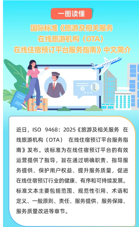 我國牽頭制定全球首個在線旅游機構相關國際標準,以“中國方案”推動全球旅游服務標準化進程。近日,我國牽頭制定的《旅游及相關服務在線旅游機構(OTA)在線住宿預訂平臺服務指南》(ISO9468:2025)國際標準正式發(fā)布。這是全球首個在線旅游機構相關國際標準,旨在規(guī)范全球在線住宿預訂平臺及其服務,破解“大數(shù)據(jù)殺熟”“捆綁消費”“退改難”等痛點,構建公平透明的消費生態(tài)?!吨改稀访鞔_了平臺方和住宿服務提供商的責任,規(guī)范了訂購、支付、退改、評價等環(huán)節(jié)的服務條款,提出了信息安全、財務安全和隱私保護等方面的服務保障要求。其發(fā)布是中國參與全球標準化工作的生動實踐,將推動全球旅游服務在標準化軌道上實現(xiàn)高質(zhì)量發(fā)展。