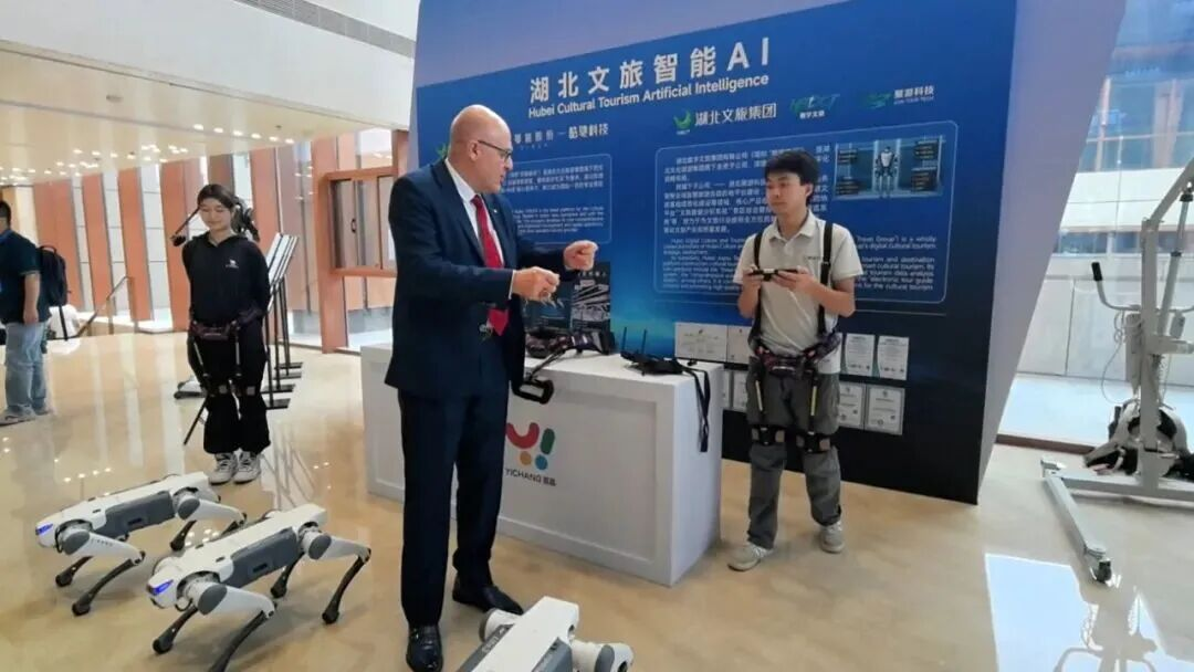 全球旅行商大會(huì)宜昌啟幕,湖北文旅集團(tuán)展示“文旅+科技”新體驗(yàn)。9月6日,以“知音湖北 大美長(zhǎng)江”為主題的知音湖北?2025全球旅行商大會(huì)暨宜昌市文化旅游發(fā)展大會(huì)在湖北宜昌召開(kāi),本次大會(huì)由湖北省文化和旅游廳、宜昌市人民政府聯(lián)合主辦。來(lái)自40多個(gè)國(guó)家和地區(qū)的旅行商及各界代表共600余人齊聚長(zhǎng)江之畔,以“知音”為紐帶共話合作,以行動(dòng)助力“引客入鄂”戰(zhàn)略,現(xiàn)場(chǎng)多項(xiàng)文旅合作項(xiàng)目集中簽約,為湖北文旅國(guó)際化發(fā)展注入強(qiáng)勁動(dòng)力。湖北文旅集團(tuán)攜多款智能設(shè)備終端亮相大會(huì),其中外骨骼機(jī)器人和機(jī)器狗成為全場(chǎng)焦點(diǎn),吸引了眾多國(guó)際嘉賓駐足體驗(yàn)。